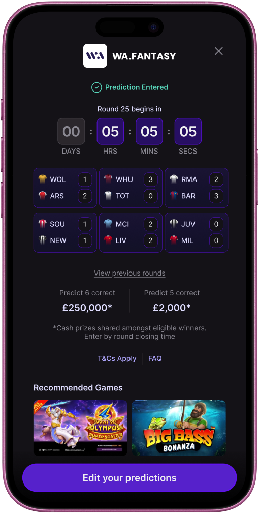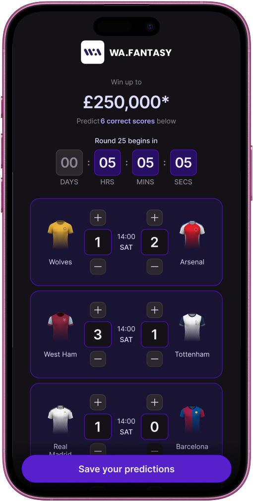 Predict 6 runs on a fixed weekly cycle aligned to Premier League fixtures. Users select exact scores for six matches, submit before kick-off, and win if their predictions are correct — with a £250,000 jackpot designed to be newsworthy and shareable. The simplicity is the product.